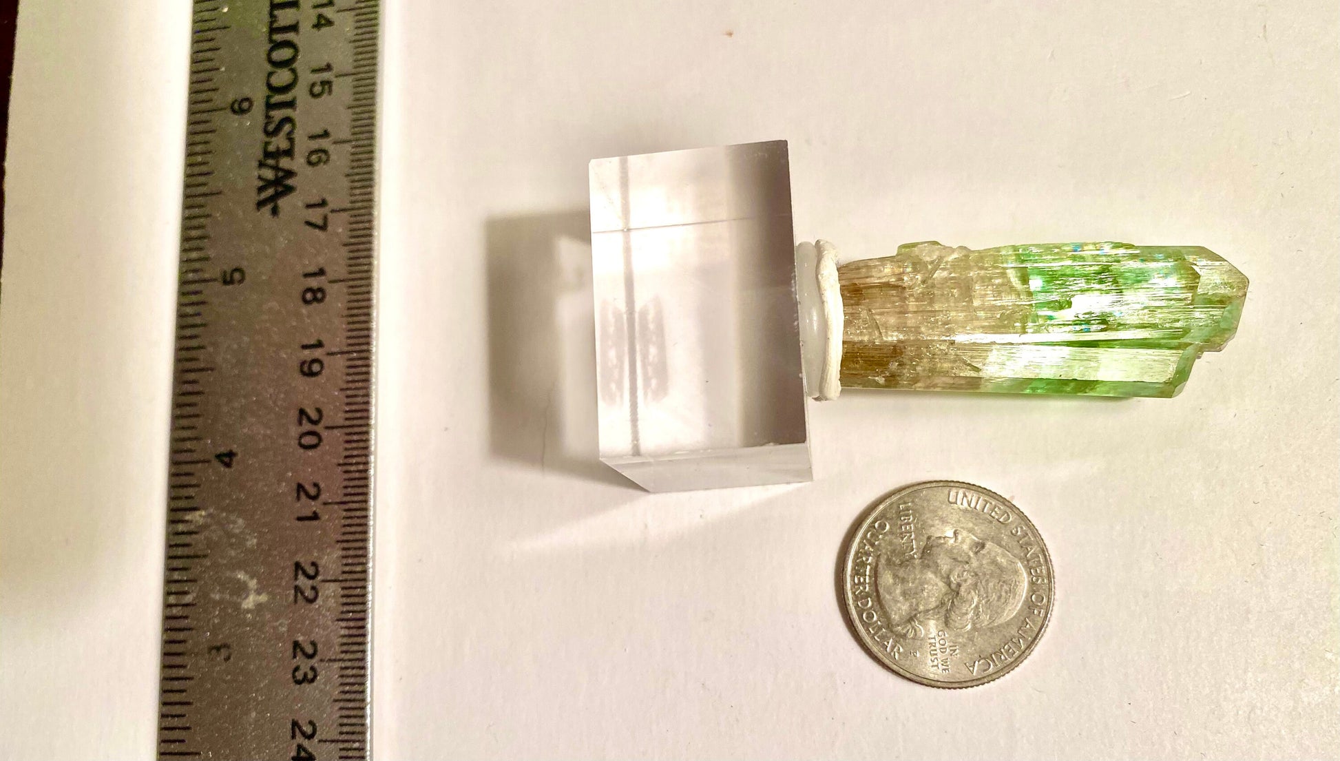 This is a bi-colored tourmaline. It was mined in Paprok, India. It weighs 18.61g and its dimensions are 4.7cm(1.85in.)x1.7cm(.67in)x1.2cm(.47in). It has a hardness of 7 to 8 on the Mohs scale. It fills the emotional body with a radiance of joy, it calms worry and fear. It stimulates the awakening of the true Self in the “Higher Heart”. This is truly an amazing crystal.